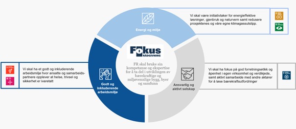 Fokus Rådgivning sin ambisjon er å bidra til en bærekraftig fremtid gjennom egen virksomhet, rådgivning i prosjekter og bedriftens samfunnsansvar. Vi skal bruke vår kompetanse og ekspertise for å ta del i utviklingen av bærekraftige og klimavennlige bygg, byer og samfunn.